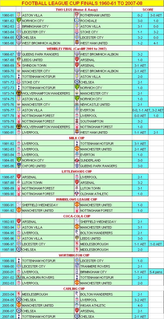 League Cup Last 32 Appearances 1960-61 to 2007-08