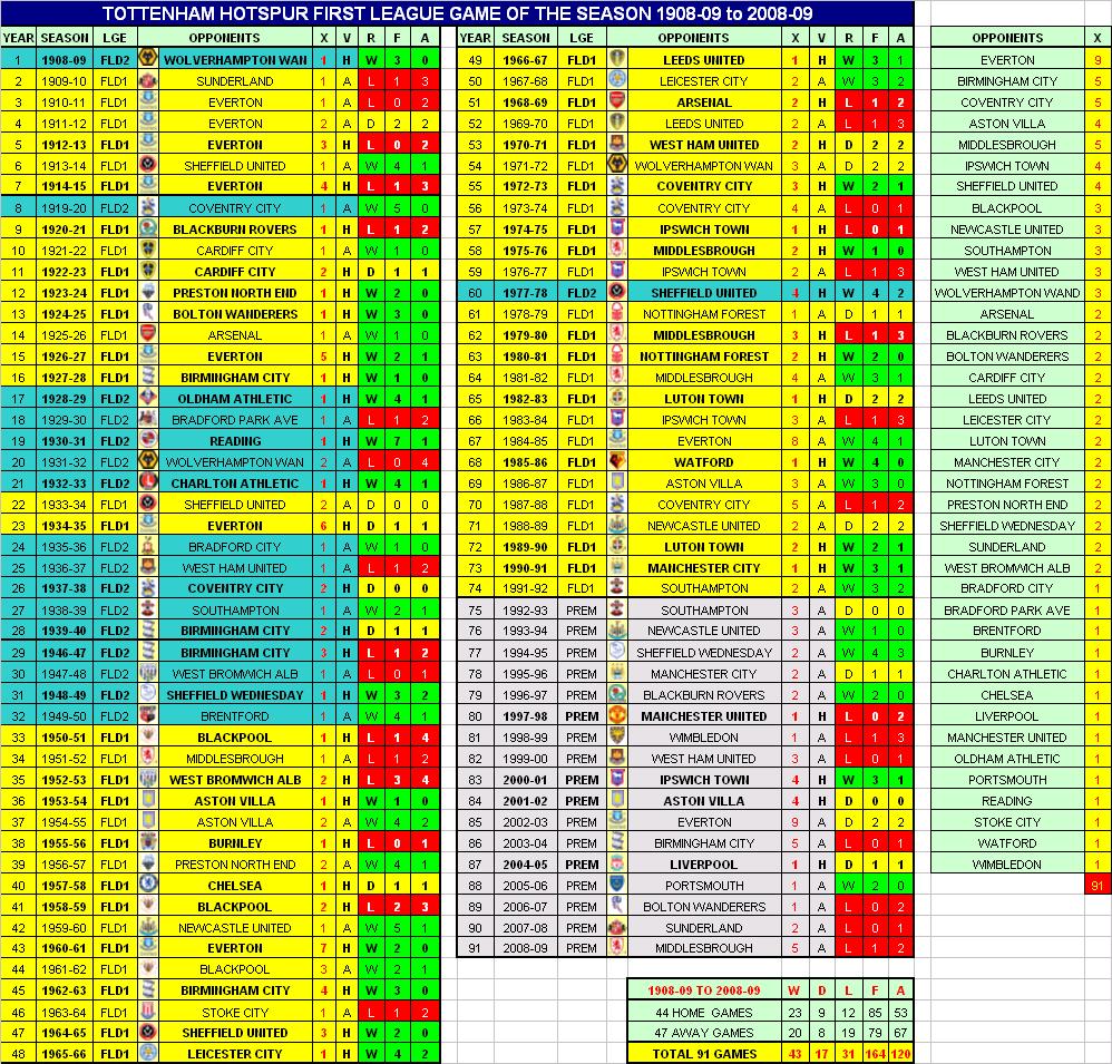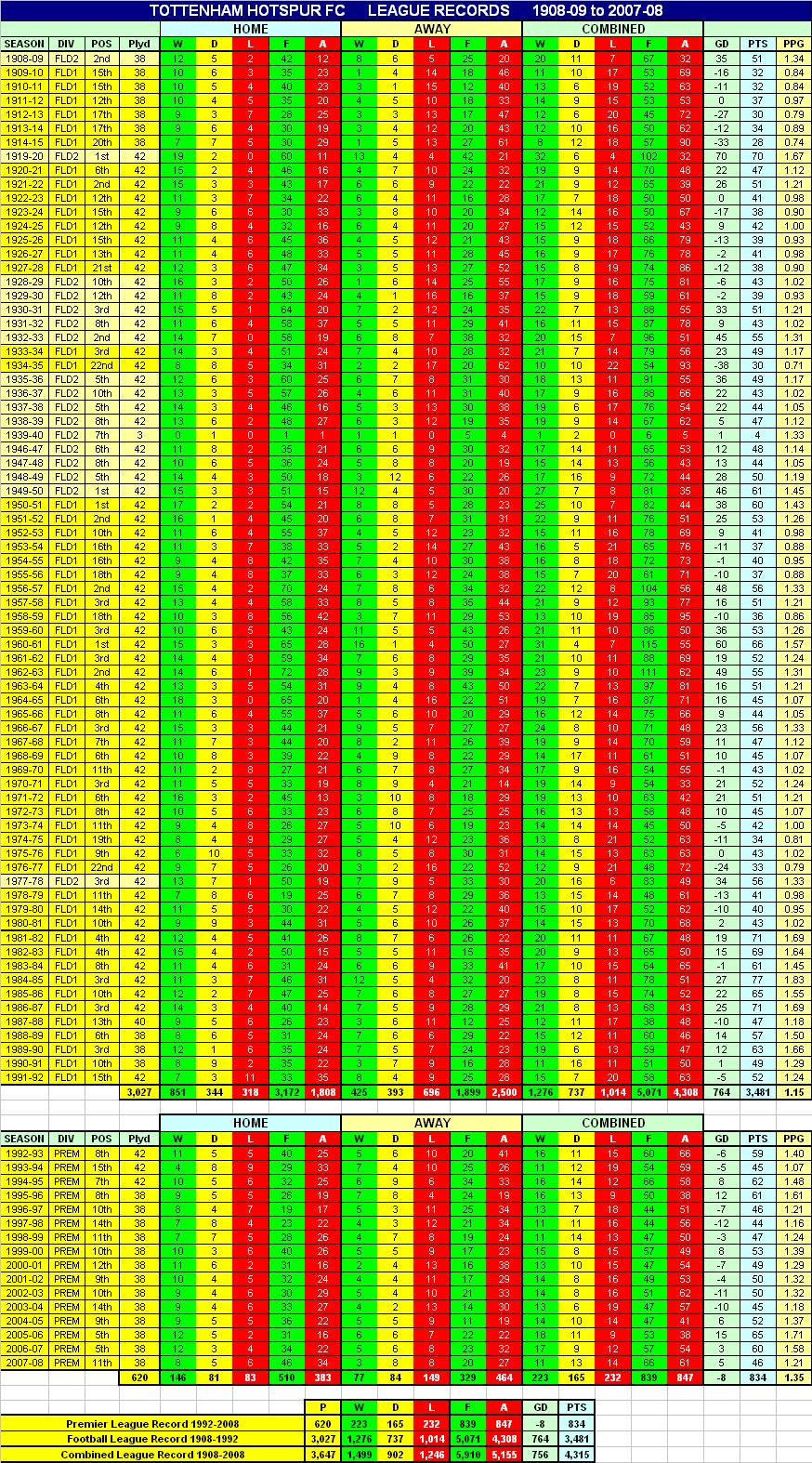 Tottenham Hotspur League Records 1908-09 to 2007-08