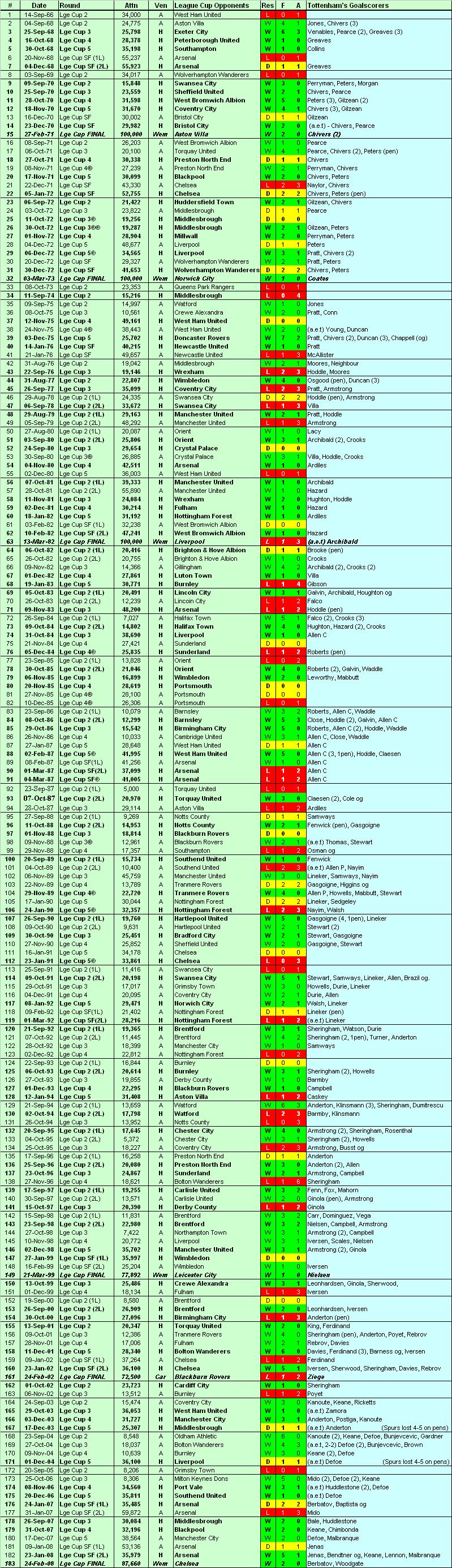 Tottenham Hotspur Lge Cup Record 1966-67 to 2007-08