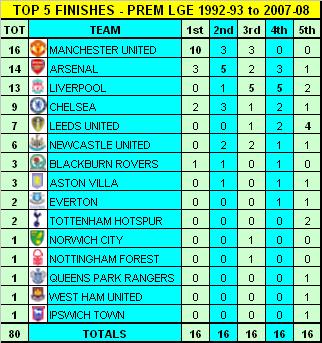 Top 5 Premier League Finishes 1992-93 to 2007-08