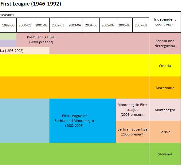 Timeline detailing the splits from the Yugoslav First League from season 1990-91 onwards.