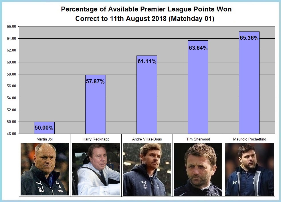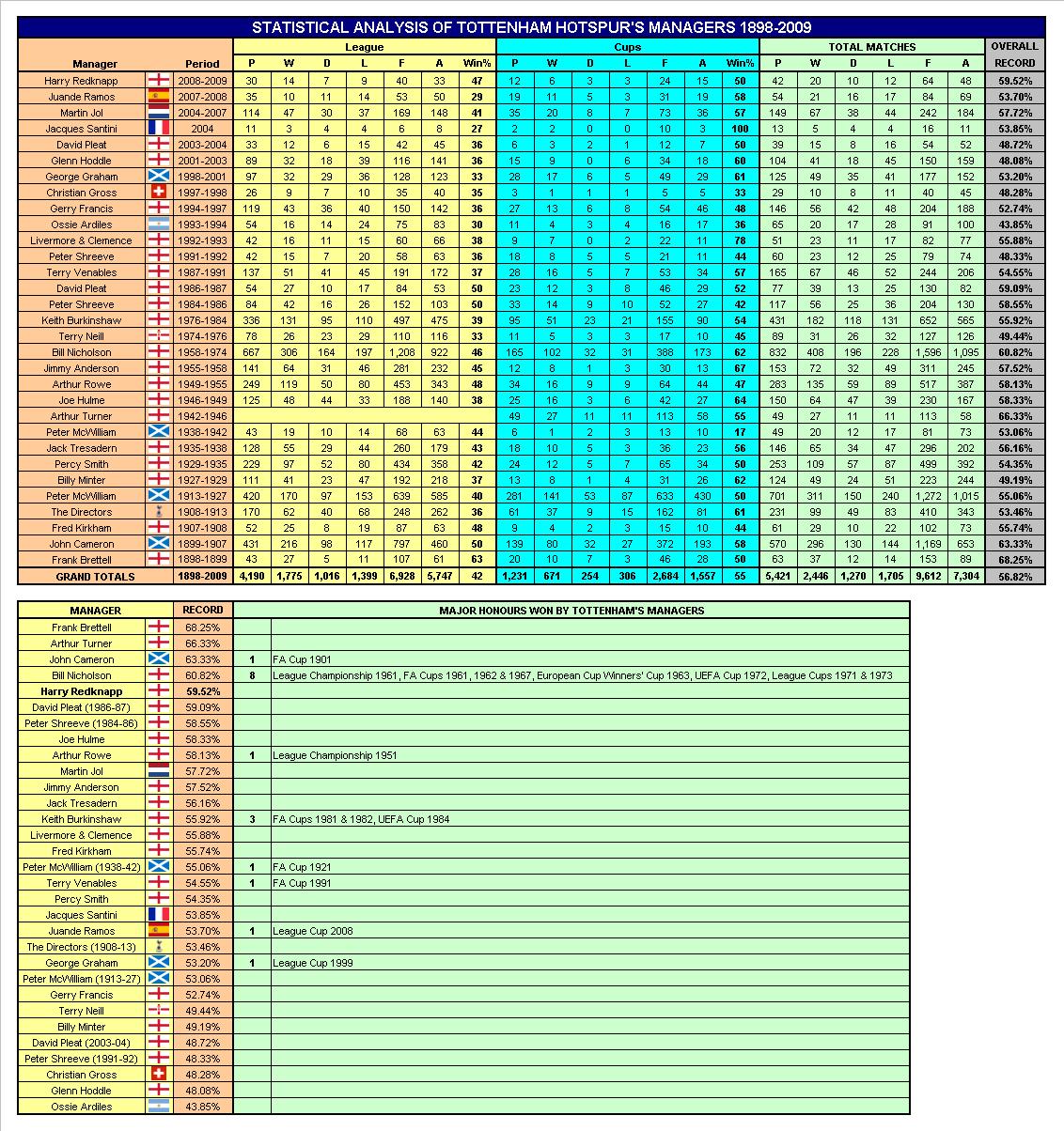 Tottenham Hotspur's Manager's records from 1898 to 2019 for League matches, Cup games and overall records.