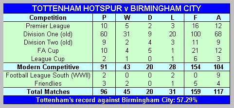 Saturday afternoon's match will be the 97th meeting between Spurs and Birmingham. Here are the results of the previous 96 games with Spurs' score shown first: