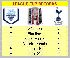 Preston's record in the League Cup is not very impressive - they've only ever managed to progress as far as the last 16 (4th Round) while Spurs have won the competition on four occasions and been losing finalists three times, including last season when they lost on penalties to Manchester United after a goalless match after extra time.