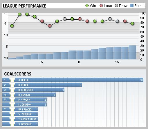 Spurs come into the game fresh from a very impressive 3-0 home win over Manchester City which boosted the club's confidence after several disappointing results which has seen the North London club drop from third to fifth in the table. Niko Kranjcar scored twice against City with the third coming from man on fire Jermain Defoe, who now has 14 goals to his credit this season, 13 of which came in the Premier League. Defoe's strike partner for the City game was Peter Crouch, who contributed two assists.
