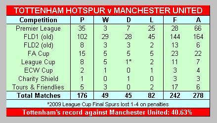 The reverse fixture at the Lane earlier last September was won 3-1 by United, who became the only team this season to put two or more goals past Spurs at home this season. In fact they are the only team to score more than once at White Hart Lane in the League since Harry Redknapp took over as manager. United took four points off Spurs in the Premier League during 2008-09, as well as winning the Football League (Carling) Cup Final at Wembley on penalties after a goalless 120 minutes.