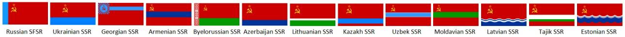 From 1922 to 1991 as Union of Soviet Socialist Republics. 13 of the 15 Soviet Republics had clubs competing in the Top Flight League with only Turkmen SSR and